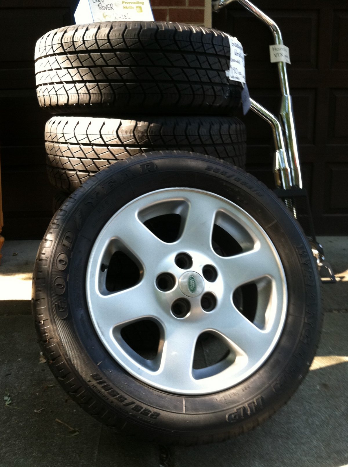 4 Good Year Wrangler Tires-almost new with less than 1500 original miles. Mounted on Land Rover Discovery 2003 18″ OEM. Wheel Rim Comet aluminum alloy rims with caps. Plus Extra: 1 Good Year Wrangler spare on Land Rover Discovery Rim with approximately 10,000 miles.