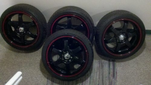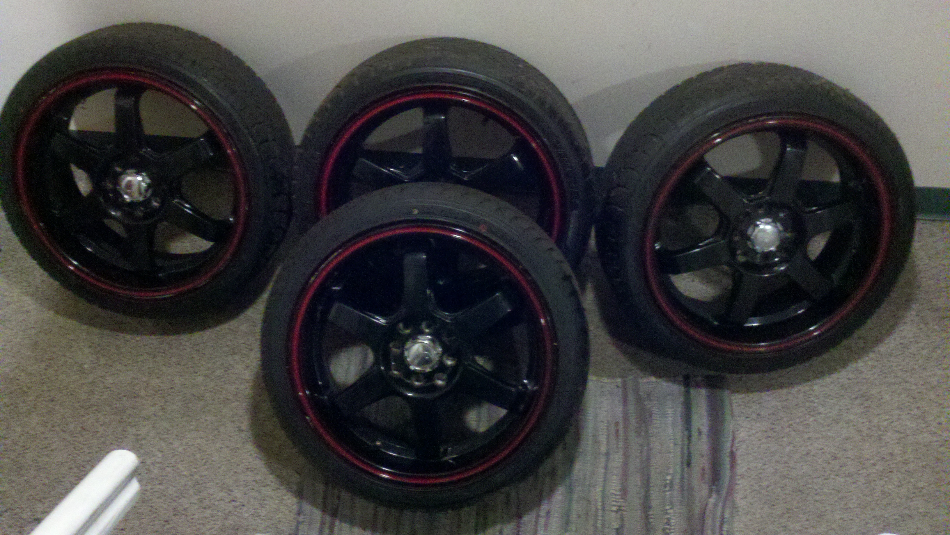 Black rims w/ red lip and tires