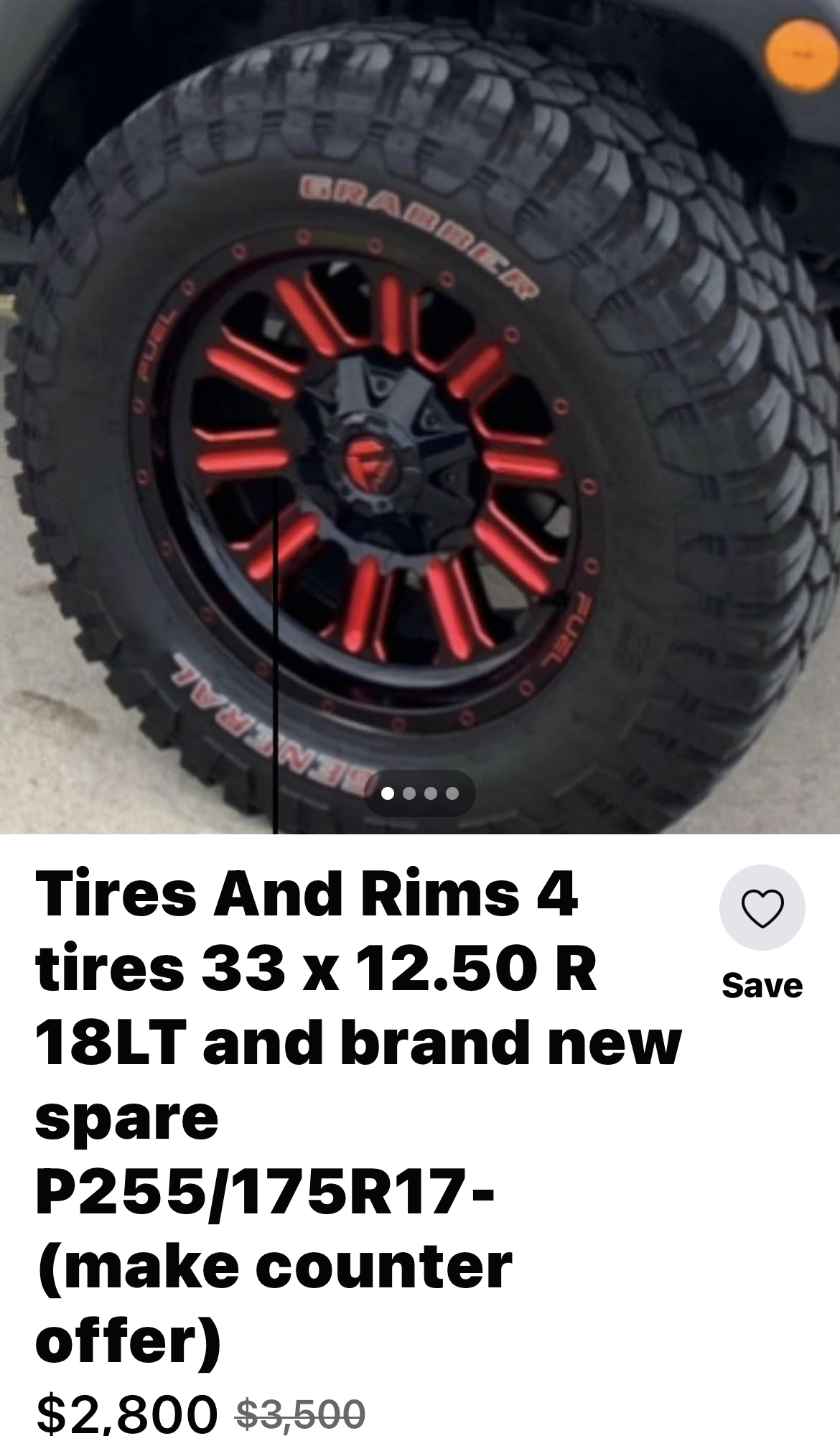 Tires And Rims 4 tires 33 × 12.50 R 18LT and brand new spare P255/17517- $2,000 Texas Report problemProcessing your request, Please wait....Offensive ContentInvalid OfferSpamOther× Home U.S.A Texas Tires And Rims 4 tires 33 × 12.50 R 18LT and brand new spare P255/17517- This ad listing is expired. Photo Gallery All photos (2) Tires And Rims 4 tires 33 × 12.50 R 18LT and brand new spare P255/17517- × Additional InfoAd TypeI Am OfferingTire BrandGeneralNew/UsedUsedSeasonsAll-Seasons TiresCountryU.S.AState/ProvinceTexasCitySan AntonioZip/Postal Code78201Tires And Rims 4 tires 33 × 12.50 R 18LT and brand new spare P255/17517- mvallejo01 Listing Owner Member Since: October 19, 2023 San Antonio Texas 78201 Sold Ads2x 245/40R18 97V Dunlop SP Sport Maxx GT 600A 7.5/32” Used Tires1x LIKE NEW 235/60R17 102H Goodyear Assurance Comfortred Touring 10.5/32” Used Tires1x 205/65R16 95H Kumho Solus TA31 6.5/32” Used Tire2x 285/45R20 112H Goodyear Eagle Sport All Season RunOnFlat 7.5/32” Used Tires1x 225/50R17 94V Goodyear Assurance Maxlife 8.5/32” Used Tire2020 ram 6 lug 20sMaxxis Razr Mt Tires (Full Set) LT295/60R20BRIDGESTONE BLIZZAK SNOW TIRESLike New Tires!Used Good Year Wrangler DuratracShare Ad