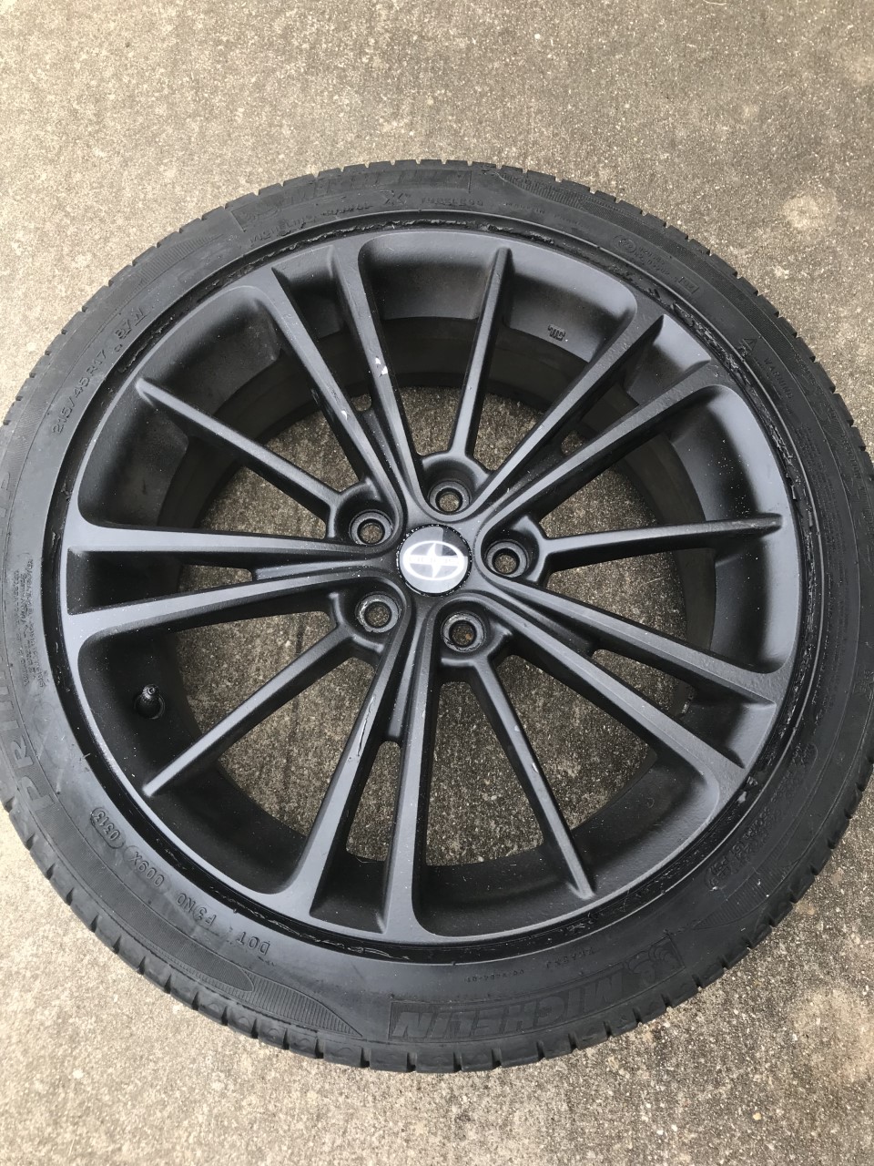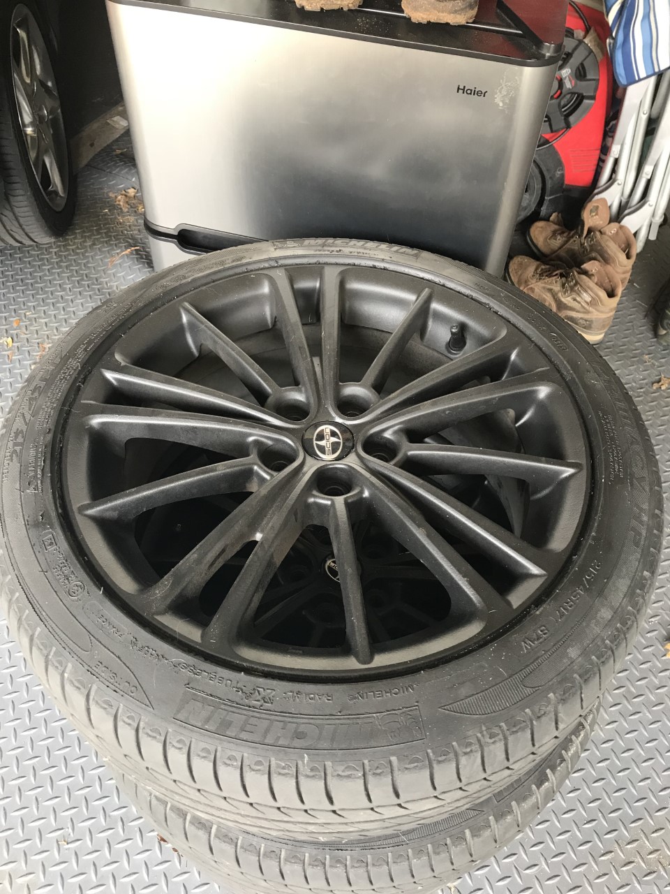Used 2014 Scion FR-S stock wheels & tires. Plasti-dip on wheels can easily come off with WD-40 and/or break cleaner if needed.  Would be great for another set of spares or for racing or just to resell. Looking to sell ASAP.